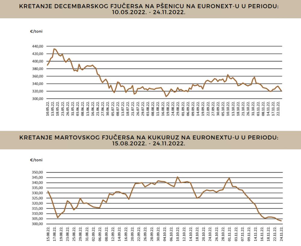 Na najvećoj evropskoj produktnoj berzi Euronext u Parizu cijena pšenice pala je protekle nedjelje za jedan odsto i iznosila je 321 euro po toni. Krajem oktobra cijena je u jednom trenutku bila dostigla 360 eura po toni, a početkom maja bila je i preko 420 eura po toni. Cijena kukuruza u Parizu pala je za 0,82 odsto i iznosila je 303 eura po toni, a tokom septembra i oktobra bila je i preko 340 eura.