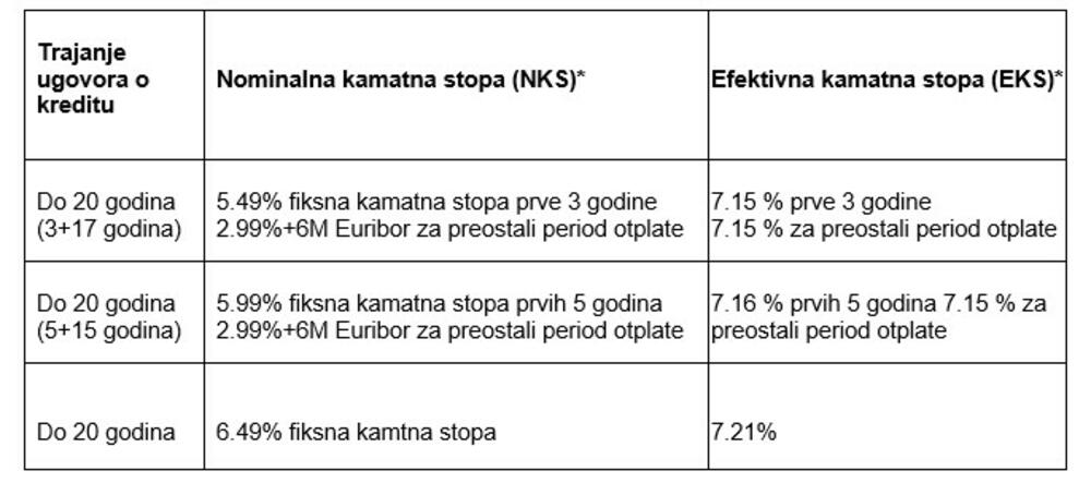 1. Za iznos kredita 50,000 € i rok otplate 240 mjeseci, kamatne stope na godišnjem nivou iznose: u prve tri godine nominalna kamatna stopa (NKS) je 5,49% fiksno, efektivna kamatna stopa (EKS) je 7,15%; nakon tri godine nominalna kamatna stopa je 2,99% + 6M Euribor, efektivna kamatna stopa (EKS) je 7,15%.