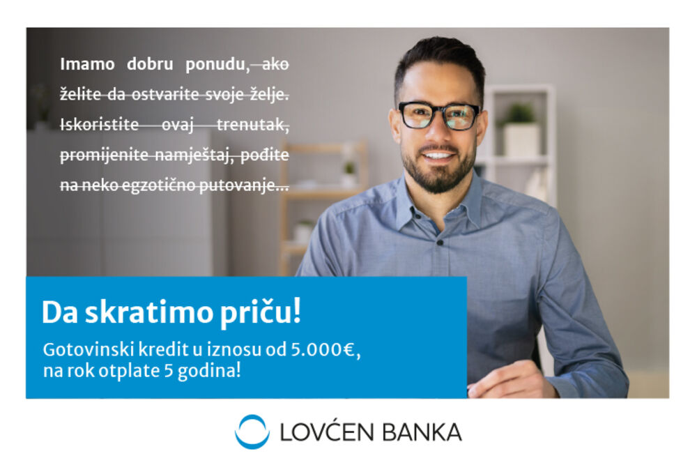 Lovćen banka pripremila je posebnu ponudu - gotovinski kredit u iznosu od 5000€ na rok otplate 5 godina, uz mjesečni anuitet od 98,98€. Kredit je namijenjen svim postojećim klijentima banke, kao i onima koji to trenutno nisu, bez uslova za prenos zarade. Imajući u vidu da je moguće da su iz različitih razloga građani već zaduženi prethodnim kreditima, Lovćen banka ovim proizvodom pomoći će svima da jednostavnije dođu do sredstava i riješe trenutne potrebe uz izuzetno laku, brzu i jednostavnu proceduru odobrenja. Niži iznos mjesečne obaveze olakšaće otplatu ovog kredita, a odobrena novčana sredstva mogu se upotrijebiti za bilo koju vrstu kupovine.