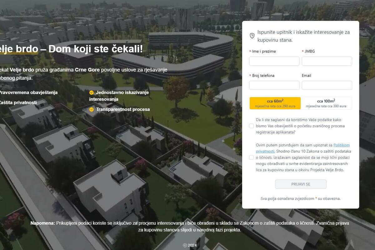 Takođe mogu da iskažu interesovanje za kupovinu stana od oko 60 eura za koji je, kako piše na sajtu mjesečna rada oko 290 eura ili za stan od oko 100 kvadrata za koji je mjesečna rata oko 390 eura