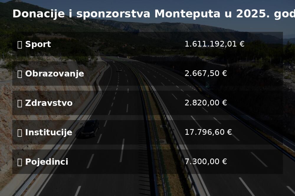 Kompanija “Monteput” d.o.o. tokom 2025. godine izdvojila je najmanje 1.739.113,12 eura za donacije i sponzorstva, pokazuju podaci iz dostavljenih odluka i ugovora. Podrška je bila usmjerena na sport, obrazovanje, zdravstvo, institucije, ali i pojedince kojima je pomoć bila potrebna za liječenje, školovanje i profesionalni razvoj.