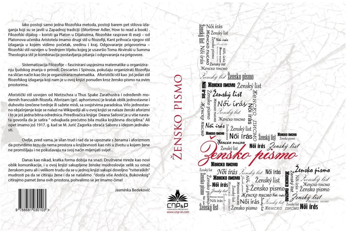 Knjiga aforizama “Žensko pismo” čija je priređivačica Deana Sailović, biće predstavljena sjutra u 19 časova u organizaciji Narodne biblioteke Budve i u njihovim prostorijama. Na budvanskom predstavljanju “Ženskog pisma” će pored priređivača učestvovati autor predgovora Vladislav Vlahović i autorke čiji su se aforizmi našli u knjizi: Slavka Klikovac, Milojka Jovović, Milica Aranitović Papović, Nina Sarić, Maja Mišnić i Esma Sarić. Autorke će se predstaviti aforizmima, a moderatorka će biti Stanka Stanojević.