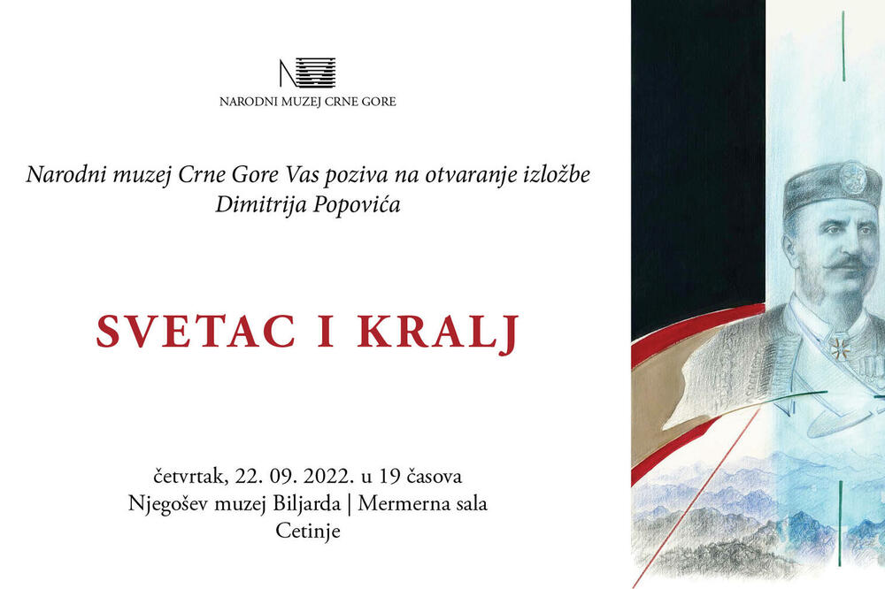 Izložba radova Dimitrija Popovića pod nazivom "Svetac i kralj" biće otvorena u četvrtak u 19 časova u Biljardi na Cetinju. Izložbu čine dvije grafičke mape, sa po 10 radova, posvećenih izuzetno značajnim ličnostima crnogorske istorije - Svetom Petru i kralju Nikoli, koje su nastale povodom obilježavanja godišnjica smrti ovih velikana (190 godina od smrti Petra I i 100 godina od smrti kralja Nikole).