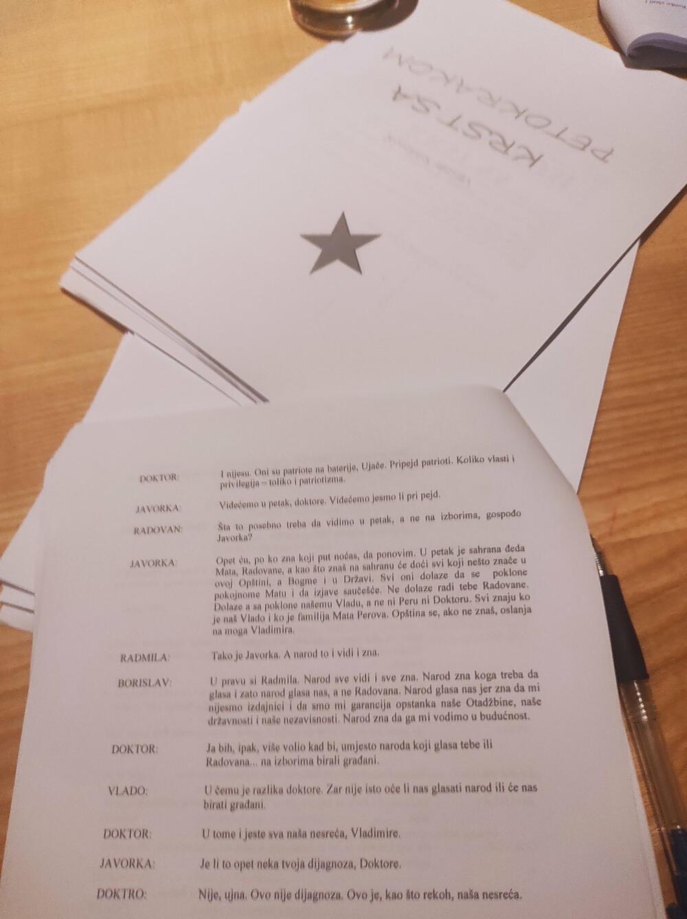 Tekst „Krst sa petokrakom“, podsjećaju, na bijenalnom konkursu Crnogorskog narodnog pozorišta 2019. godine istaknut je, uz nagrađeni tekst, od strane stručnog žirija i preporučen za izvođenje, što već govori o njegovom kvalitetu i potencijalu. U obrazloženju žirija, na čijem čelu je bio istaknuti dramsku pisac Stevan Koprivica stoji i: „Krst sa petokrakom je obdukcioni nalaz trulog posttranzicijskog tkiva, sa preciznom dijagnozom koja upućuje na ozbiljne boljke sistema i istovremeno demistifikuje političke krađe i interese i sav jad i čemer političke trgovine.“