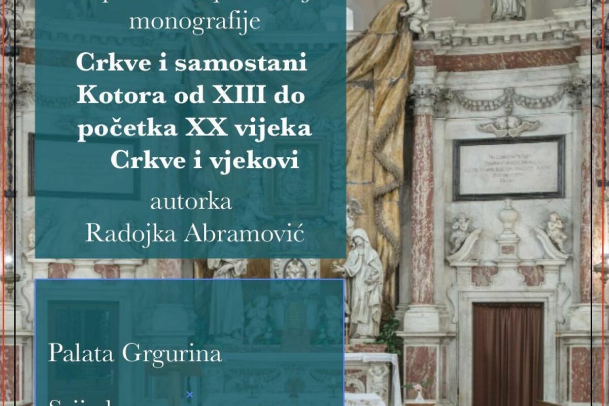 Povodom 21. novembra - Dana Opštine Kotor, u Pomorskom muzeju Crne Goreu Kotoru danas u 19 časova održaće se promocija monografije „Crkve i samostani od XIII do početka XX vijeka, Crkve i vjekovi“, autorke Radojke Abramović, istoričarke umjetnosti, muzejske savjetnice.