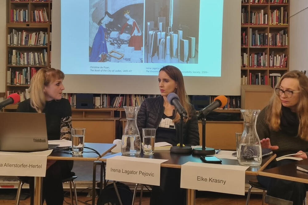 "Kada sam u ljeto 2019. prvi put srela Irenu Lagator, obje smo se bavile ženskom gradnjom gradova: tačnije, gradnjom gradova kroz konstruisanje knjiga. Irena Lagator Pejović je pripremala svoju izložbu "Za opšte dobro" u okviru programa izložbi savremene umjetnosti Im Vorbeigehen na Katoličkom privatnom univerzitetu (KU) u Lincu; Ja, Monika Lajš Kisl pripremala sam tekst o djelu 'Livre de la Cité des dames' (Knjiga o gradu žena) Kristine Pizanske. Na prvi pogled vidjela sam toliko paralela i tihih odnosa između ove dvije autorke, da me je to tjeralo da istražujem dalje. Kada sam se susrela sa Irenom Lagator u njenom studiju na Cetinju u ljeto 2022. godine, odlučile smo da osmislimo esej o tim skrivenim nitima kroz period od 600 godina evropske istorije. Možemo naći čvorišta, prvo u obliku knjige, zatim u temi grada, i konačno u svijesti o odgovornosti. Zato, isprobajmo ovaj narativ i vratimo se sa Cetinja i iz Podgorice u Crnoj Gori - mjesta u kom Irena Lagator Pejović radi i živi, preko Linca u Austriji - mjesta izložbe i dinamičnog univerziteta, i Bazela u Švajcarskoj - mjesta u kom sam se bavila istraživanjem, napisala tekst i naposljetku osmislila svoju knjigu 'Gospa Razumnost i pisanje istorije' - u Pariz 14/15. vijeka u Francuskoj - gdje je, na burgundskom dvoru, Kristina Pizanska napisala i oslikala svoj(e) rukopis(e)", zapisala je Lajš Kisl.