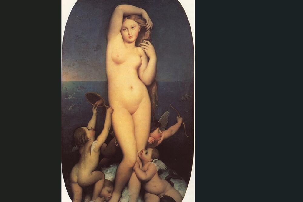 Vénus Anadyomène je bazirana na idejama i skicama koje je Ingres napravio još 1807-8, ali proći će čak 40 godina prije nego što će tadašnji vizuelni inventar koji je slikar brižljivo pripremio - fetišizacija i jeste već neka vrsta fragmentacije, metonimijskog raspodjeljivanja imaginarne cjeline - biti finalno povezan, prije nego što će ‘razbacani’ elementi, koji su vjerovatno predugo, ali možda i, naprotiv, upravo u pravom omjeru držani u arhivi, biti adekvatno ‘ušiveni’. A taj šav je uvijek vještački: slika se sklapa i konstruiše, ona se organizuje kroz principe harmonije i ritma.