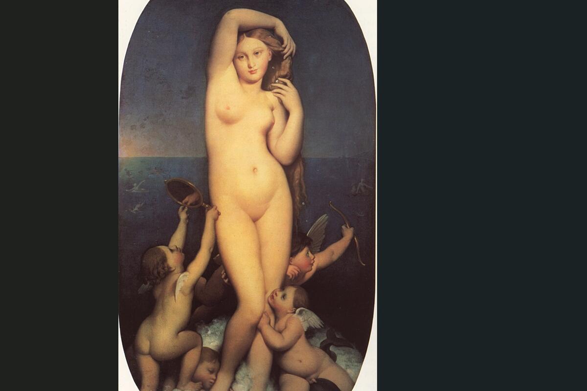 Nasuprot tome, donji sloj slike je prostor u kome se, zapravo, odvija seksualna korupcija gdje Venerini pratioci, četiri Kupida, svaki na svoj način, otjelovljavaju potisnutu erotsku energiju bez koje nema sublimacije: ogledalo kao narcistička prijetnja autoerotičnosti, obožavanje stopala što je, dakako, za Ingresa pogrešna vrsta fetišističke ekstaze, divlja libidalna snaga delfina sa zakrvavljenim okom kojeg jaše putto sa razotkrivenim genitalijama i luk sa kojeg je već ispaljena falička strijela u pravcu nečeg što, u stvari, može biti scena otmice Evrope.