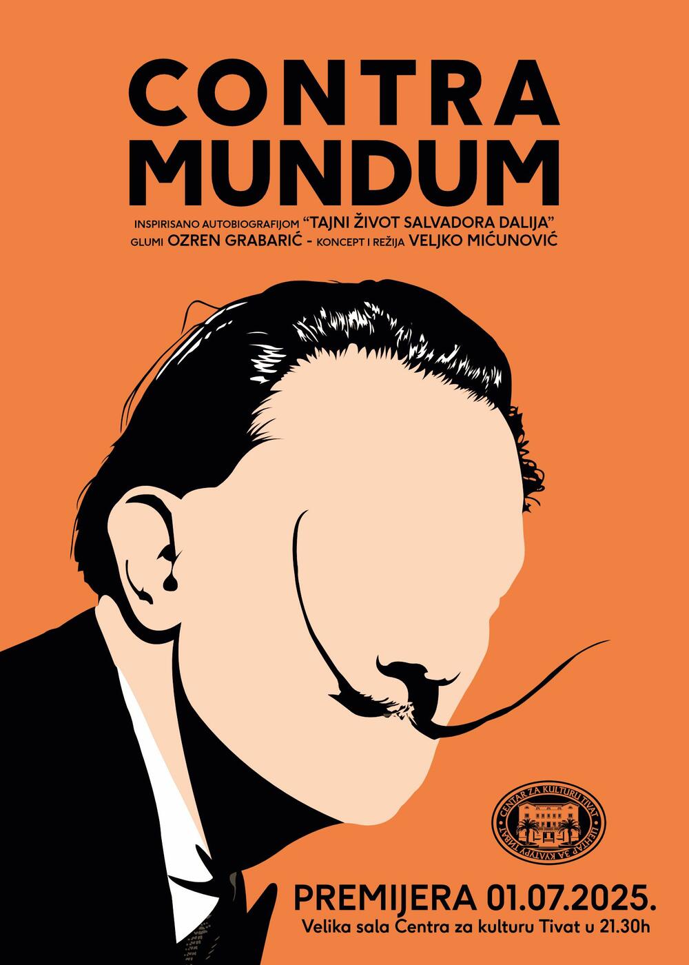 Nova produkcija Centra za kulturu Tivat, pozorišna predstava “Contra mundum”, inspirisana autobiografijom “Tajni život Salvadora Dalija”, premijerno će biti izvedena večeras, u 21.30 časova u Velikoj dvorani Centra za kulturu Tivat. Repriza novog tivatskog pozorišnog komada zakazana je za srijedu 2. jul u 21.30 sati.