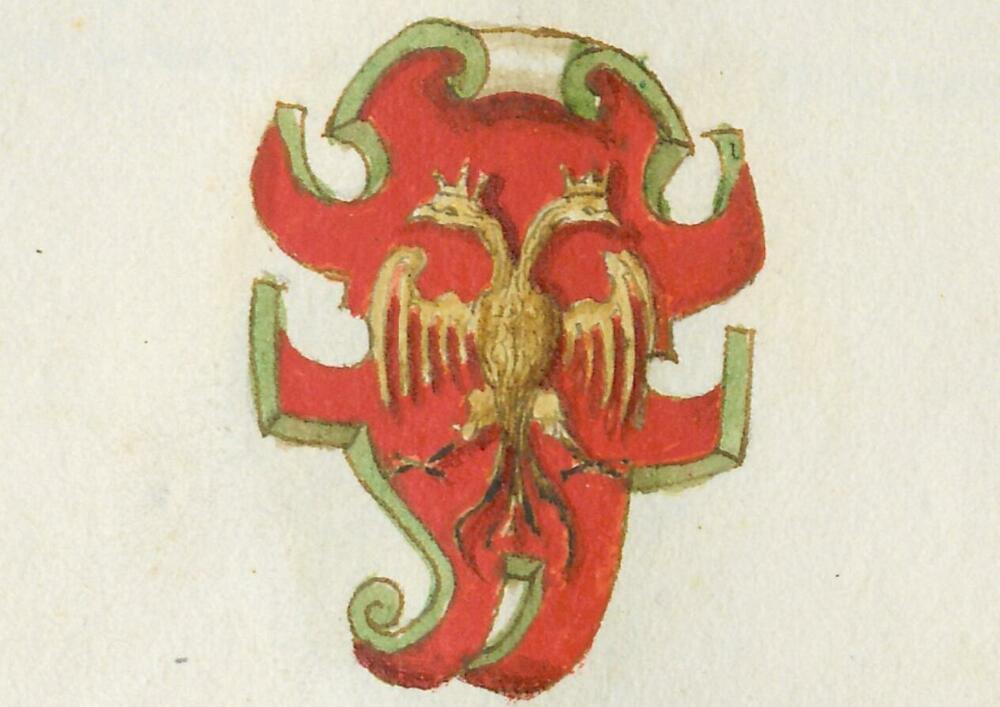 Heraldički elementi takođe odgovaraju ranijim rukopisima. Oba grba krasi prepoznatljivi zlatni dvoglavi orao, raširenih krila, na crvenoj pozadini. Jedina razlika ogleda se u krunama na glavama orlova, koje se nalaze na prvom grbu. Grbovi su izuzetne stilske ljepote, sa zlatnim orlom renesansne heraldike, čija predstava najviše podsjeća na onu sa pečata Ivana Crnojevića iz 15. vijeka.