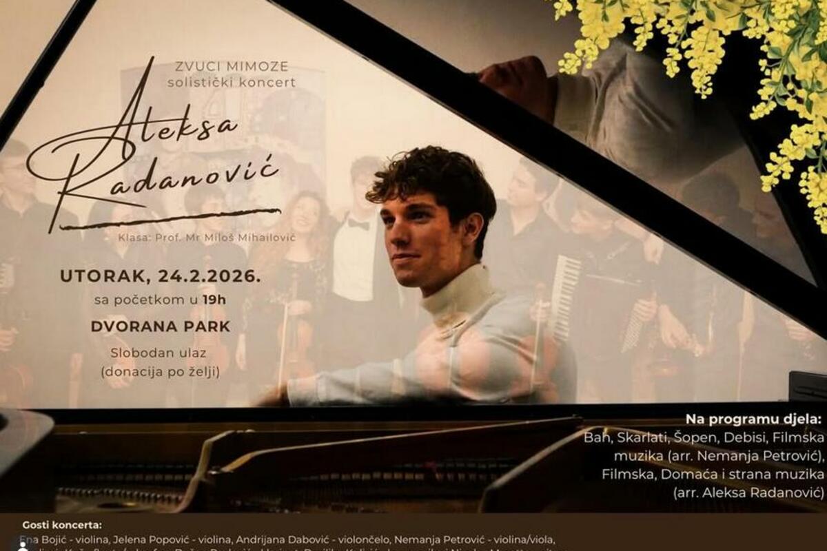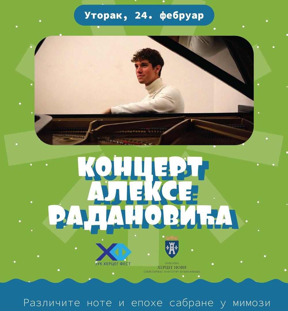 Solistički koncert održaće danas u svom rodnom gradu mladi pijanista iz Herceg Novog Aleksa Radanović u Dvorani “Park” u 19 časova, u okviru 57. izdanja Praznika mimoze, a ulaz je slobodan, uz donaciju po želji.