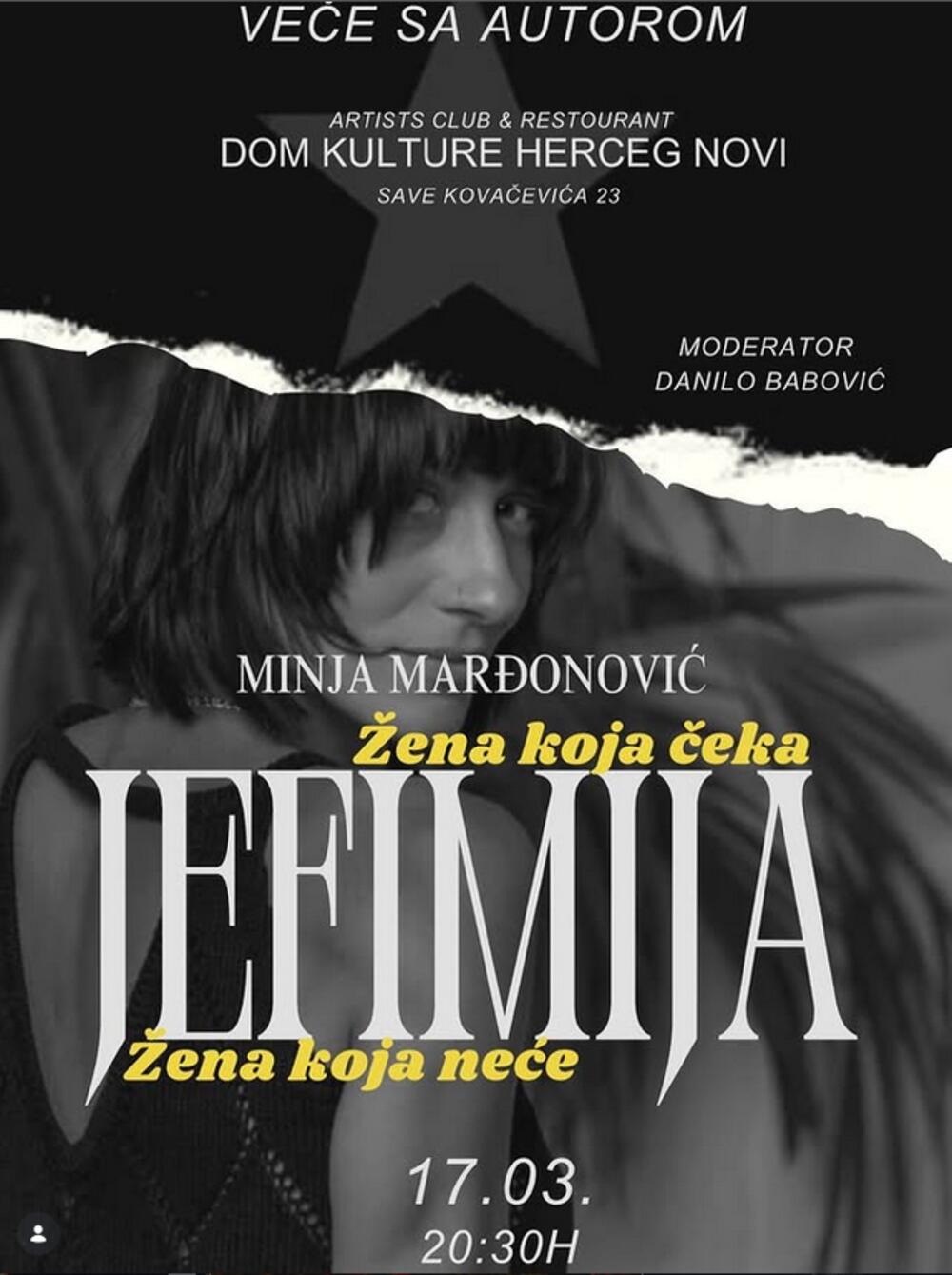 “Usmjerena na svoj literalni, aktivistički rad, živeći neko vrijeme u Indoneziji, Minja Marđonović je napisala svoj prvi roman ‘Jefimija, žena koja čeka’, ne bi li na taj način romantičnoj beletristici ponudila alternativniji pristup lično-političkom životu jedne žene. Svojim drugim romanom, ‘Jefimija, žena koja neće’, nastavljujući Jefimijinu životnu storiju, nemilosrdno otvara pitanja ženskog tijela, moranja i htenja kao najvažnija lično-politička pitanja heteroseksulane žene u višedimenzionalnom patrijarhatu”, ističe se u najavi.