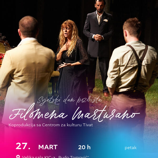 Uspješna i nagrađivana predstava u režiji Jagoša Markovića “Filomena Marturano” na današnjem je repertoaru Gradskog, u Kulturno-informativnom centru “Budo Tomović”. Međunarodnu poruku koju je ove godine uputio američki glumac Vilijem Defo, pročitaće glumica Gradskog Sanja Popović, najavljeno je.