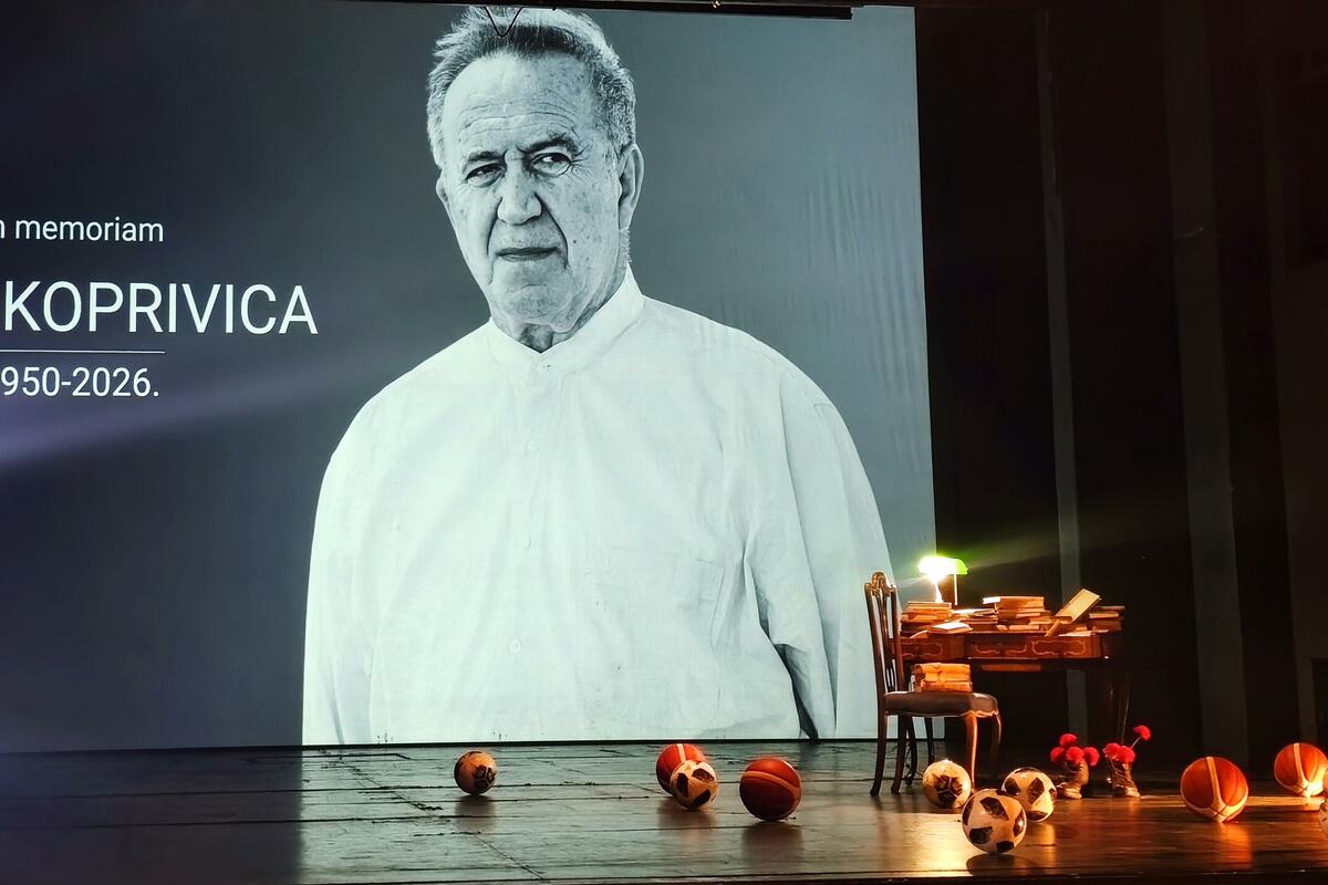 Na daskama Crnogorskog narodnog pozorišta - fudbalske lopte, pisaći sto, knjige, čizme sa razvezanim pertlama i u njima karanfili... Fotografija Boža Koprivice na velikom platnu - posmatra nas, blago skupljenih očiju, s podignutom obrvom, u bijeloj košulji s ruskom kragnom. Scenografija kakva samo uz Botu ide. I svečano teatarsko gledalište, nažalost nedovoljno ispunjeno u odnosu na ono što i koliko Božo Koprivica zaslužuje. Ali, za ljudske i umjetničke veličine, gotovo pa uvijek je tako...