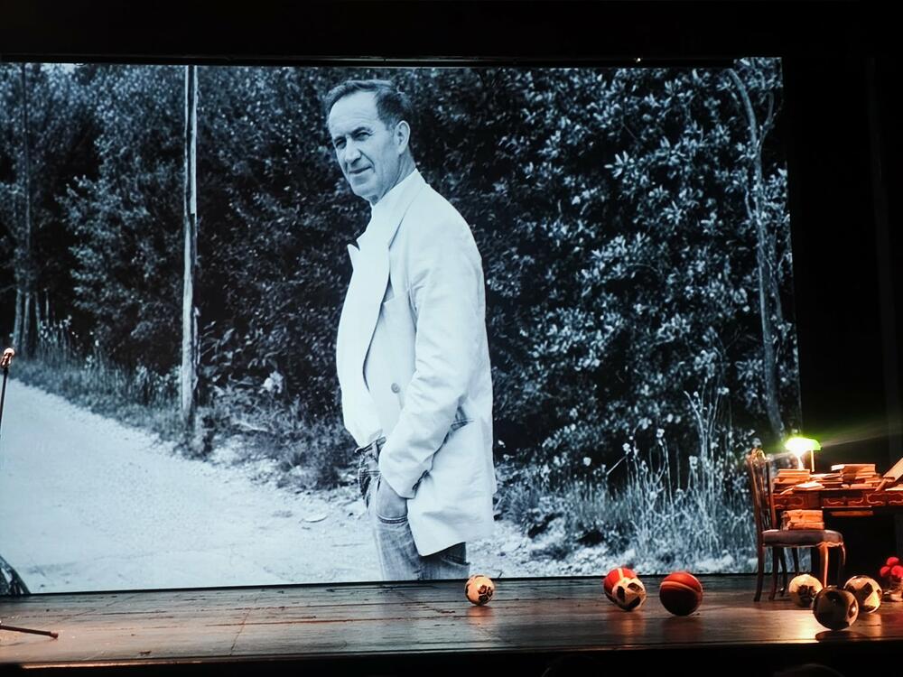 Na daskama Crnogorskog narodnog pozorišta - fudbalske lopte, pisaći sto, knjige, čizme sa razvezanim pertlama i u njima karanfili... Fotografija Boža Koprivice na velikom platnu - posmatra nas, blago skupljenih očiju, s podignutom obrvom, u bijeloj košulji s ruskom kragnom. Scenografija kakva samo uz Botu ide. I svečano teatarsko gledalište, nažalost nedovoljno ispunjeno u odnosu na ono što i koliko Božo Koprivica zaslužuje. Ali, za ljudske i umjetničke veličine, gotovo pa uvijek je tako...