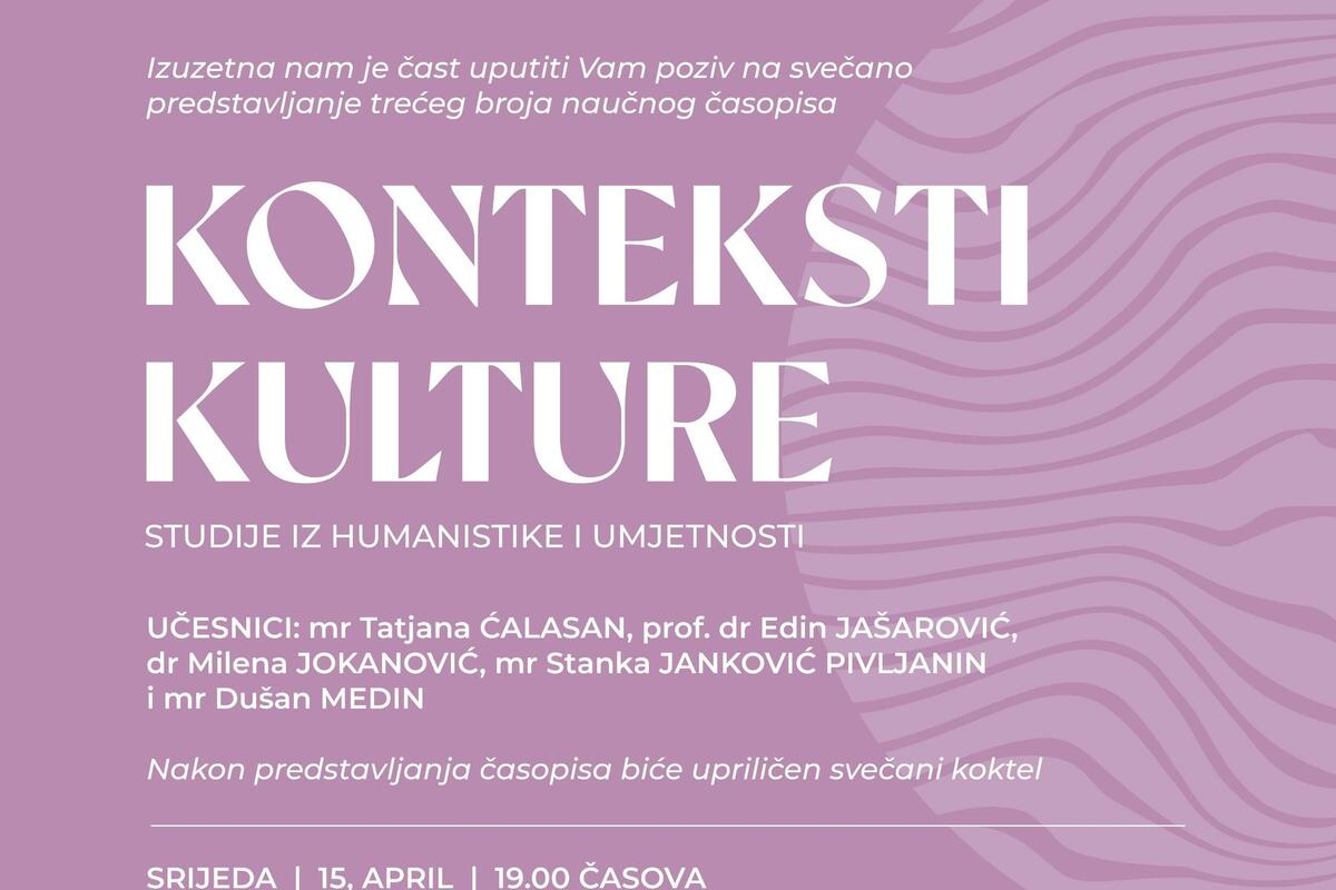 Promocija novog broja naučnog časopisa “Konteksti kulture: studije iz humanistike i umjetnosti”, biće održana sjutra u Kamernoj sali Muzičkog centra Crne Gore, u Podgorici, u 19 časova.