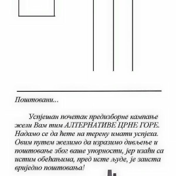 Na poleđini razglednice, pored čestitke za početak kampanje, alternativci su izrazili poštovanje i divljenje zbog upornosti DPS-a jer, smatraju oni, izlaziti godinama sa istim obećanjima, pred iste ljude, je gest vrijedan poštovanja.