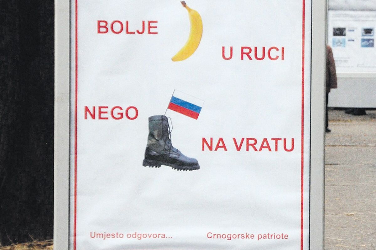 Vlada i kompanija Metropolis media nijesu željeli da odgovore ko stoji iza reklamnog panoa sa porukom "Bolje banana u ruci nego ruska čizma na vratu". Zbog te poruke, koja u suštini šteti podršci NATO-u, ambasada Rusije se žalila Vladi iz koje nezvaničnično kažu da sa spornim porukom država Crna Gora nema veze.