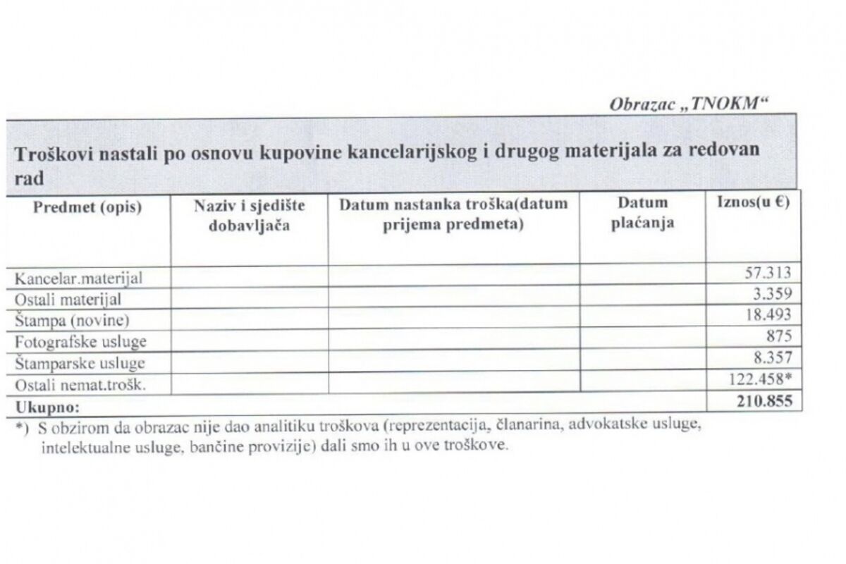 Da su to uradili i u izvještaju za 2012. stavili “ostale troškove” (koji su u 2013. iznosili enormnih 122.458 eura), a ne samo klasični kancelarijski materijal, ne bi bilo problema.