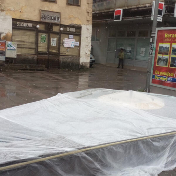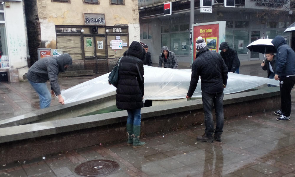 Mladi koalicije "Zdravo Berane SNP–DF" izveli su performans u glavnoj gradskoj ulici, tako što su nailonom prekrili pokvarenu gradsku fontanu, koja je ispunjena prljavom vodom.