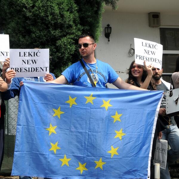 Uz snažne zvižduke pištaljki i transparente "Don't support mafia" (Ne podržavajte mafiju) i "Lekić new president" (Lekić novi predsjednik) mladi su na ogradi preko puta zgrade Delegacije istakli fotografije izbornih neregularnosti kao dokaz koji svjedoči o izbornoj krađi.