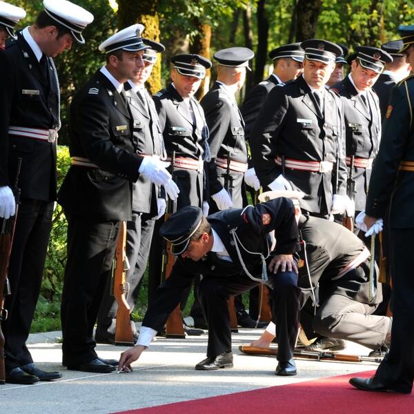U jednom momentu nekoliko vojnika postavilo je oružje na beton i puškama mjerili rastojanje od crvene staze kojom su trebali da prođu predsjednici. Nakon što je pred brojnim novinariam uzeta mjera, vojnici su liniju odredili rastežući konopac sa kraja na kraj reda. Sve to su u parku preko puta predsjedničke rezidencije posmatrali rijetki Cetinjani, pitajući se ko dolazi kod Vujanovića.