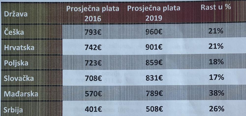 Govoreći o rastu prosječnih zarada u drugim državama, Konjević je naveo da je rast u Češkoj i Hrvatskoj iznosio 21 odsto, Poljskoj 18 odsto, Slovačkoj 17 odsto, Mađarskoj 38 odsto, a Srbiji 26 odsto.