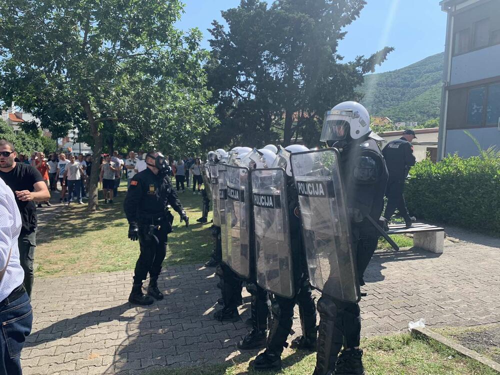 Neko od građana bacio je kamen u pravcu policije, nakon čega su funkcioneri koji su se nalazili između kordona policije i građana upozorili da se to ne radi. Krsto Radović je kazao da ne smiju dozvoliti da se isprovocira masa, “jer je to cilj onih koji su unutar zgrade”.