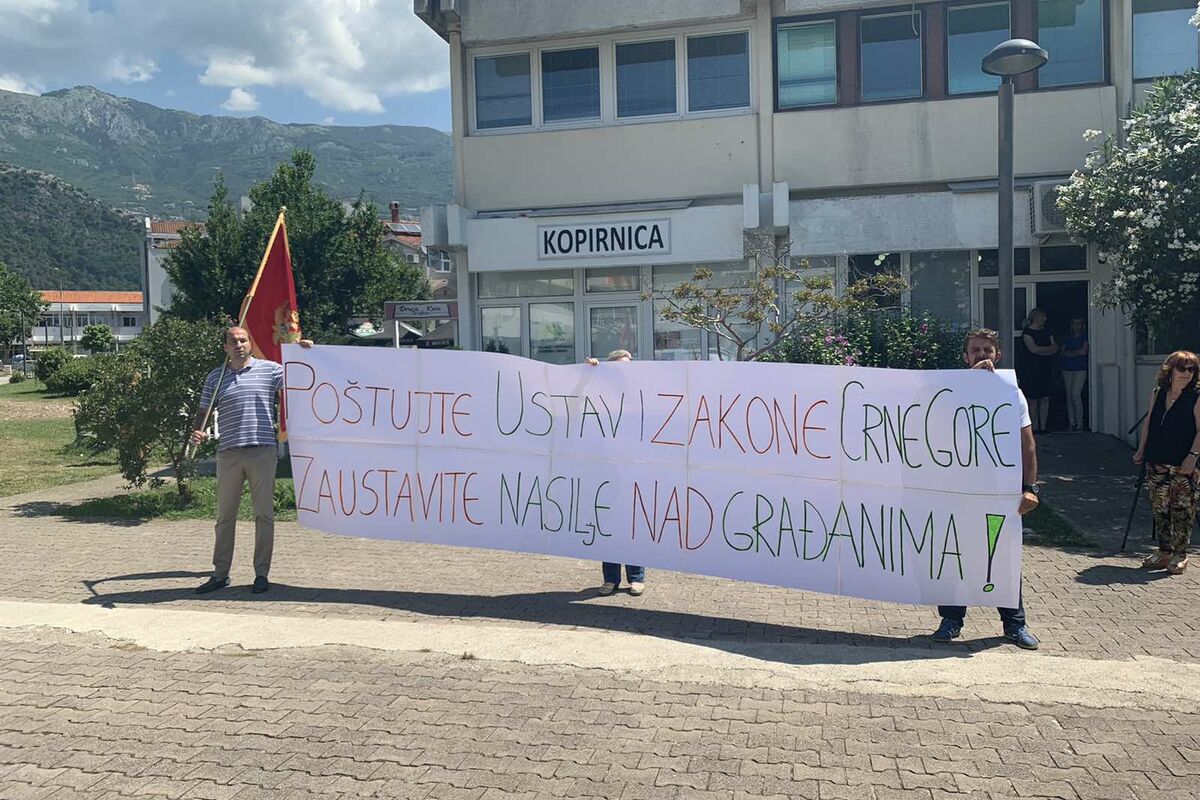 “Poštujte Ustav i zakone Crne Gore, zaustavite nasilje nad građanima” stajalo je napisano na velikom transparentu koji su nosili predstavnici budvanskog odbora Građanskog pokreta URA, na performansu održanom na platou ispred zgrade Skupštine opštine Budva.