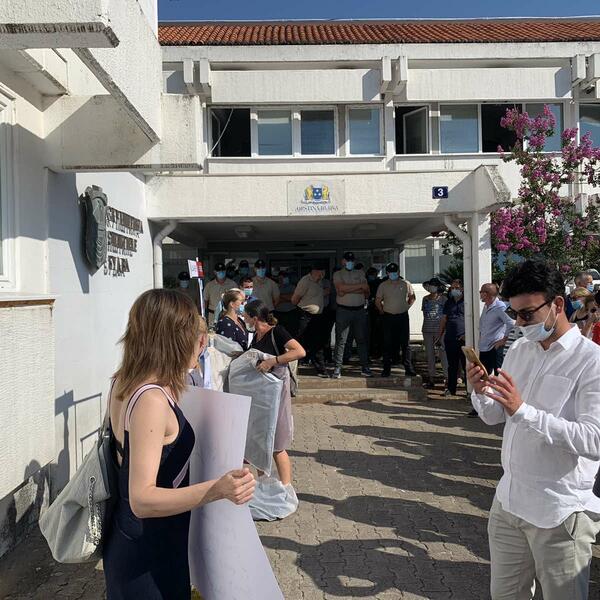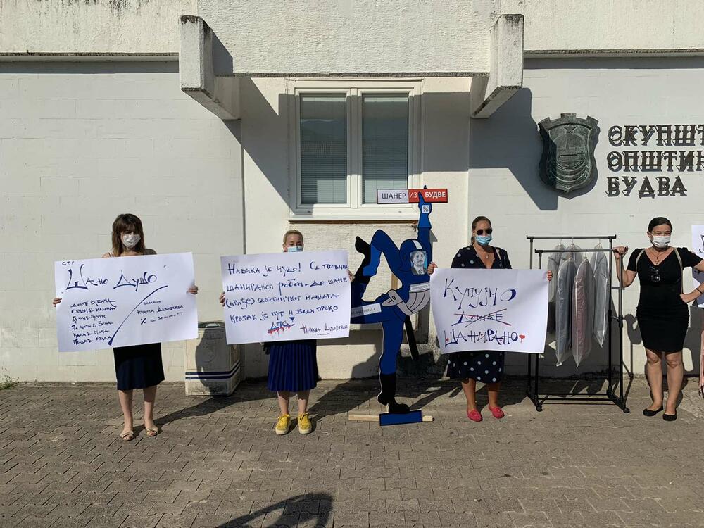 Ispred ulaza u Opštinu nekoliko građanki Budve nosile su transparente, a bio je postavljen i improvizovani čiviluk na kome su visila “markirana odijela”.