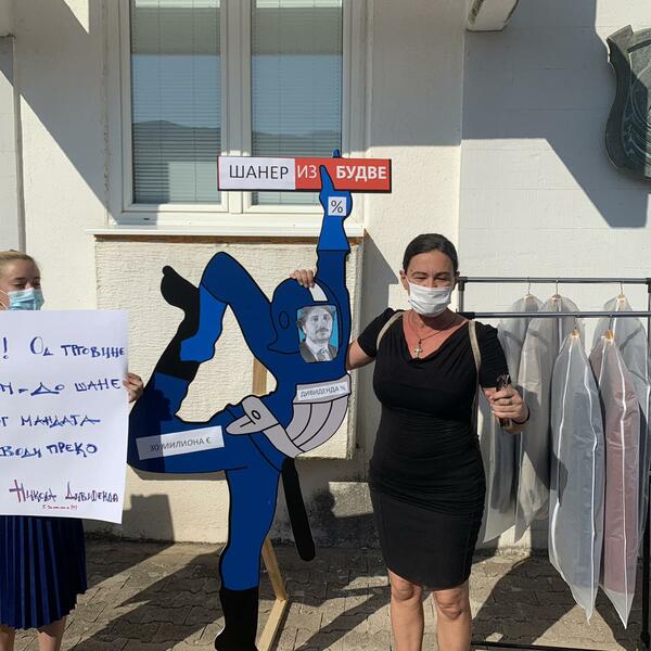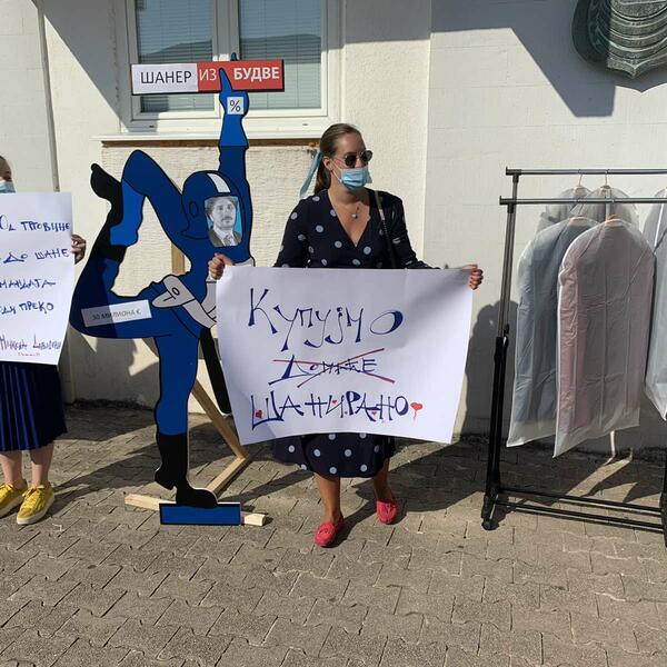 “Navika je čudo! Od trgovine šaniranom robom do šane(krađe) odborničkog mandata kratak je put i vodi preko DPS - Nikola Dividenda”, jedna je od poruka koja je bila ispisana na transparentima sa današnjeg performansa održanog ispred kordona privatnog obezbjeđenja u Budvi.