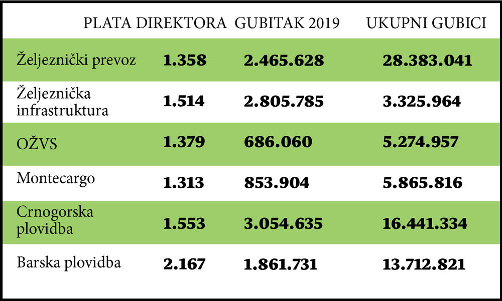 Plata izvršnog direktora OŽVS, Milorada Vukovića, u junu je iznosila 1.379 eura, dok članovi Borda nijesu dobili naknadu. Ovo preduzeće ima gubitak od ukupno 5.274.957 eura, a za poreze i doprinose duguje 2,55 miliona eura. Još jedan član željezničke gubitaške četvorke, Montecargo, dobro plaća menadžere. Izvršni direktor tog preduzeća Muradif Grbović za jun je dobio 1.313 eura, a predsjednik Borda direktora Slavenko Jovanović 604 eura. Članovima Borda naknada je iznosila po 422,8 eura. Oni su naknadu nastavili da primaju u junu, nakon što im je u periodu mart-maj bila obustavljena zbog korona-krize u skladu sa zaključcima Vlade.