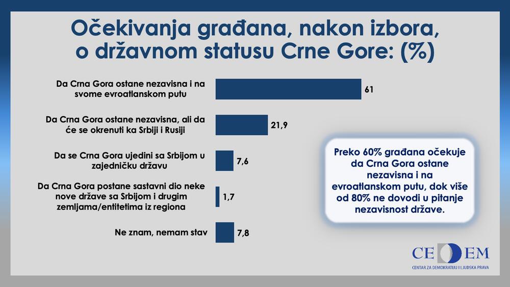 Kada su u pitanju očekivanja građana, nakon izbora, o državnom statusu Crne Gore, 61 odsto ispitanika je za to da ona ostane nezavisna i na svom evroatlantskom putu, a 21,9 odsto da ostane nezavisna, ali da se okrene Srbiji i Rusiji.