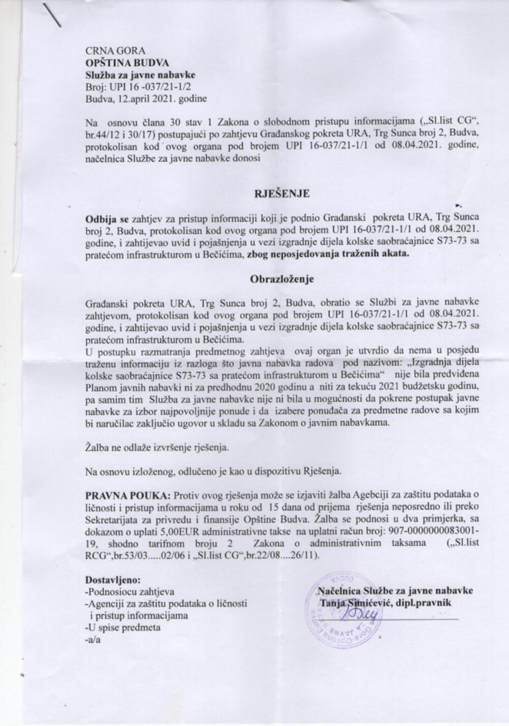 “Odgovore smo dobili od Sekretarijata za urbanizam i održivi razvoj i Službe za javne nabavke, ali ne i od Sekretarijata za investicije i Službe za naplatu ankande za komunalno opremanje građevinskog zemljišta. Da bismo građanima jasno ukazali na problem, podsjećamo da je izgradnja saobraćajnica S73 u Bečićima započeta još u toku prošle godine, te da je iste godine i završena sudeći po trenutnom stanju, iako niti prošle niti za ovu godinu nije bila predviđena Programom investicija i uređenja prostora Opštine Budva. Početak izgradnje pomenute ulice, shodno navedenoj tabli o izvođenju radova, planiran za I kvartal 2021. godine, i da se na tabli kojom se označavaju radovi Opština Budva vodi kao investitor, iako je 3.11.2020. godine Opština Budva potpisala Ugovor o naknadi za komunalo opremanje građevinskog zemljišta, prema čijem članu 6 nije obavezna da obezbijedi komunalno opremanje lokacije (komunalno opremanje podrazumijeva, između ostalog, priključak za vodovod, fekalnu i atmosfersku kanalizaciju i javnu rasvjetu, izgradnju puteva i ulica u naselju, itd.)”, stoji u saopštenju i dodaje: