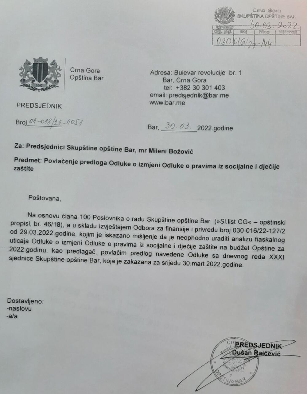 "I dok se u "5 do 12h" sa dnevnog reda sklonio Predlog izmjene Odluke o pravima iz socijalne i dječije zaštite od strane predsjednika Opštine Bar Dušana Raičevića, čime se naknada za novorođenčad neće povećati na 350 odnosno 400 eura za roditelje koji su u stanju socijalne potrebe ili nijesu zaposleni, sa druge strane, Odluka predložena od strane Mladena Đuričića, direktora barskog Vodovoda i Predsjednika Opštinskog odbora DPS-a, kojom se podiže cijena vode za obične fizičke platiše za oko 0,50 centi u prosjeku, zadržana je i izglasana od strane Koalicije DPS-BIRAM BAR-SD", ističe se u saopštenju Klub odbornika Demokrata Bar .