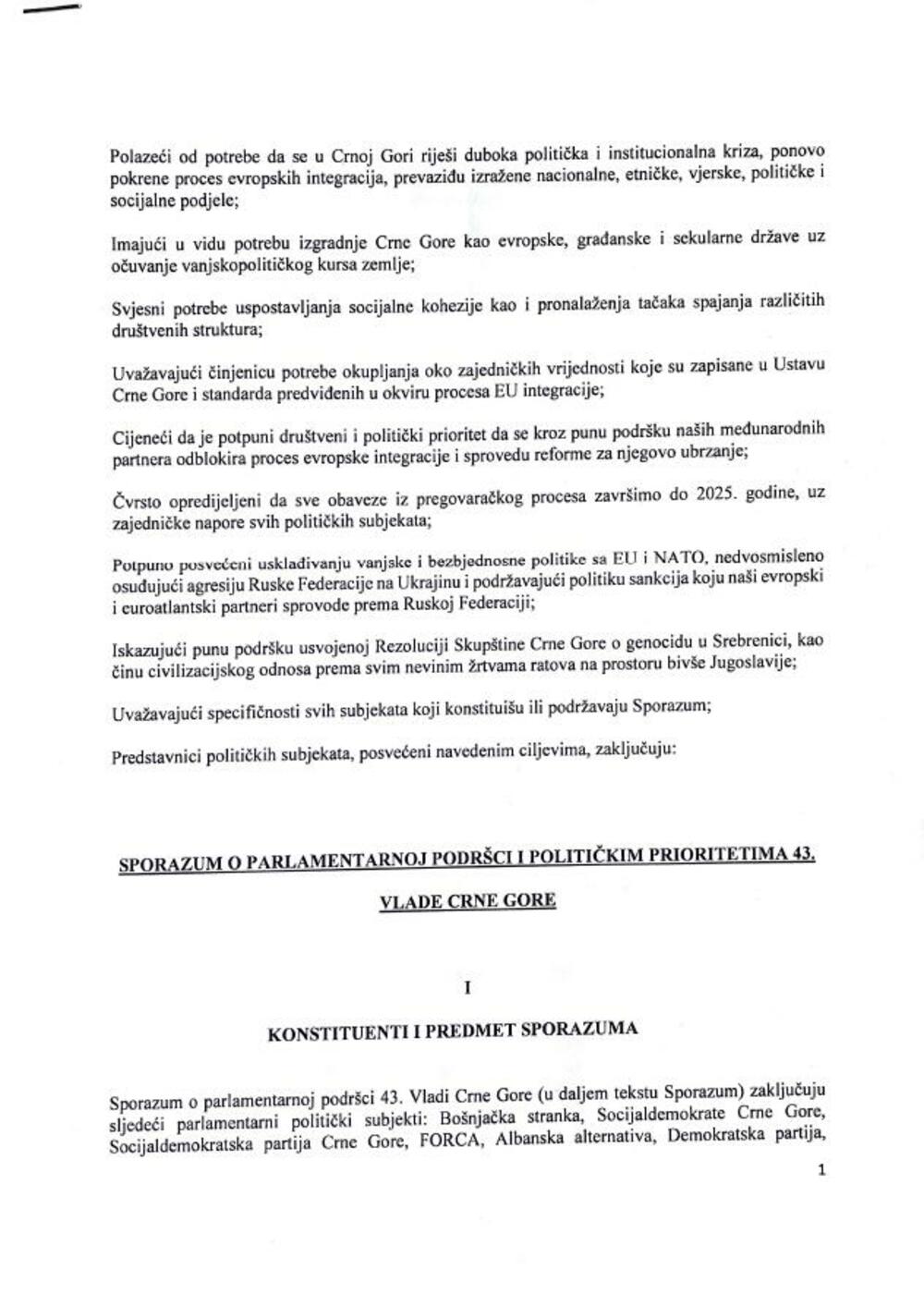 U saopštenju piše da se u novom sporazumu kao politički prioriteti Vlade navode i "regulisanje ugovornog odnosa sa vjerskim zajednicama (SPC) i sagledavanje regionalnih inicijativa (Open Balkan koji predstavlja ljepši naziv za tzv. „srpski svet“ Aleksandra Vučića), a koji u sporazumu koji je opozicija potpisala nijesu postojali kao politički prioriteti."