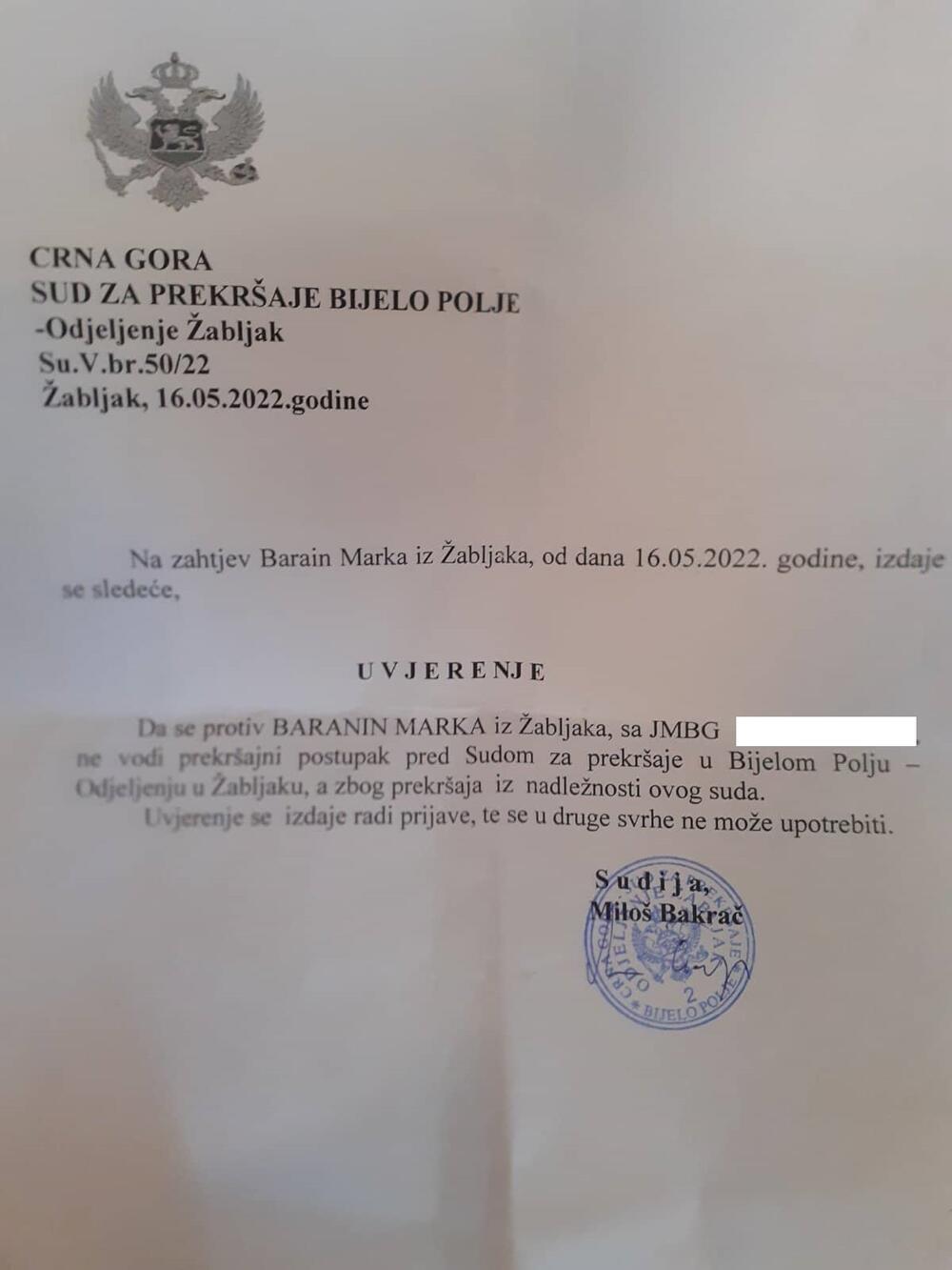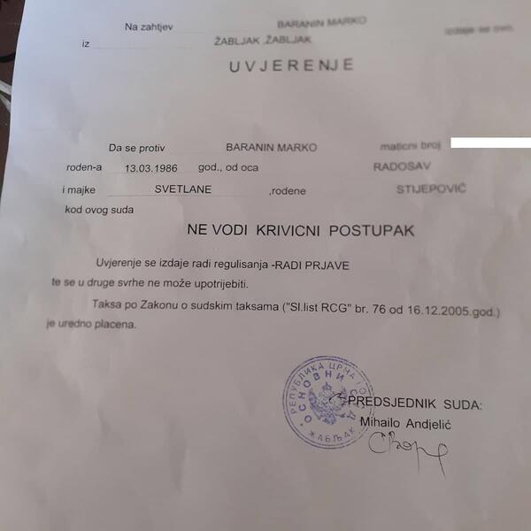 On je kao dokaz za svoje tvrdnje priložio i fotografije uvjerenja nadležnih organa da protiv njega nije vođen ni krivični ni prekršajni postupak.