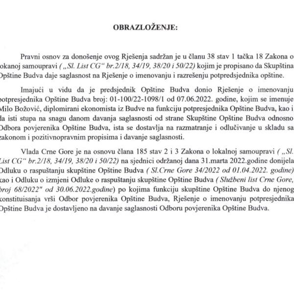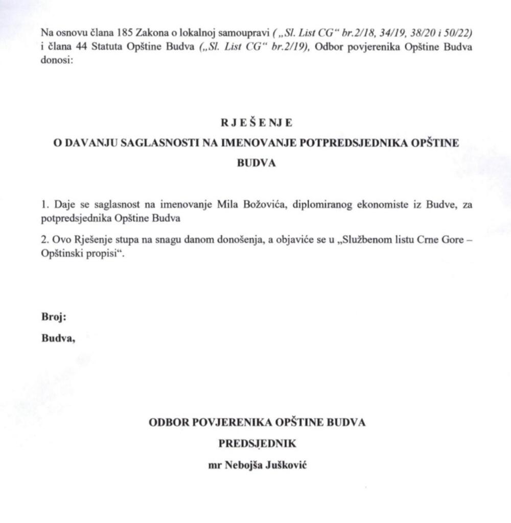 Kako se navodi u dokumentu koji potpisuje predsjednik Odbora povjerenika Nebojša Jušković, predsjednik Opštine Budva Marko Carević je 7. juna donio rješenje o imenovanju Božovića, diplomiranog ekonomiste za potpredsjednika.