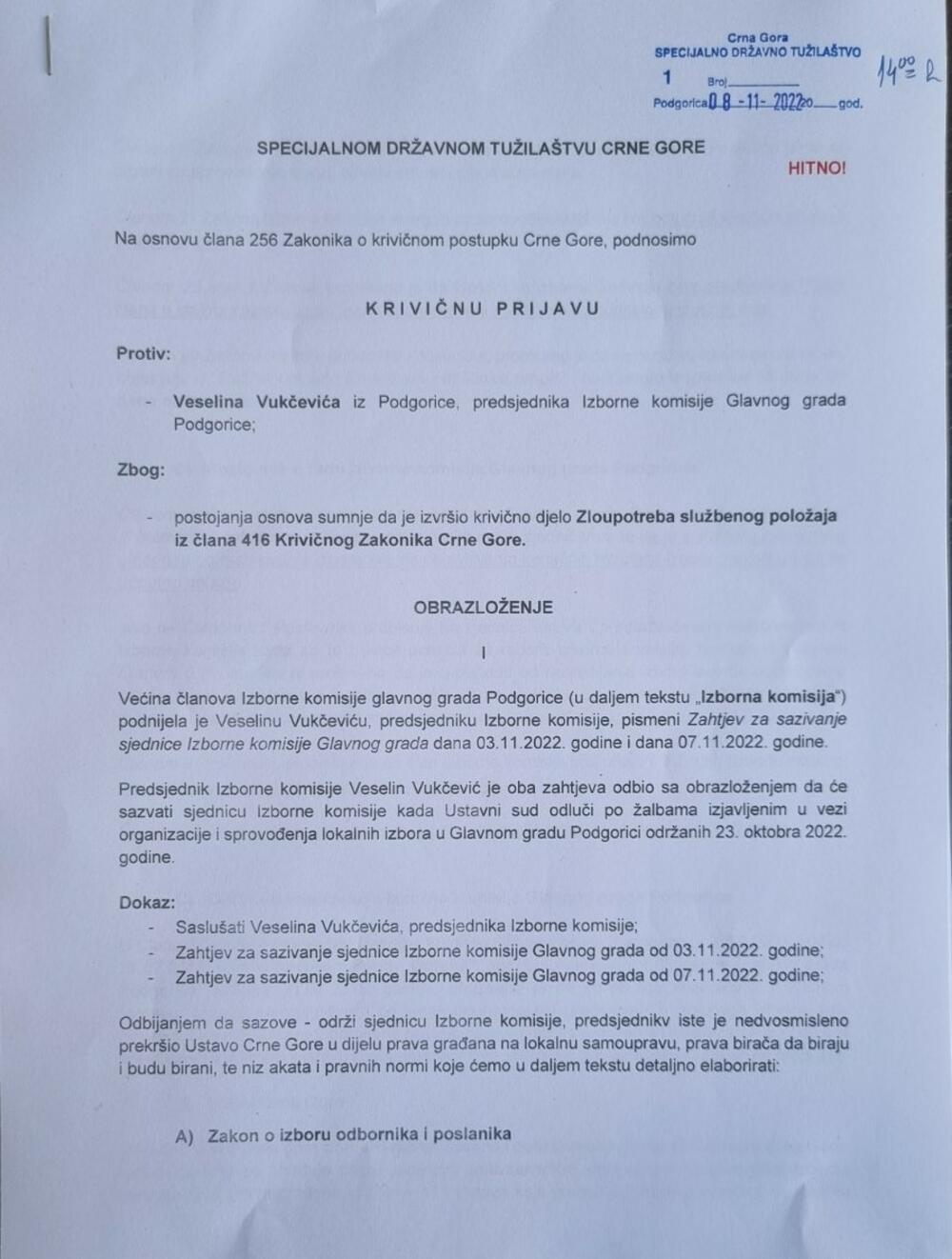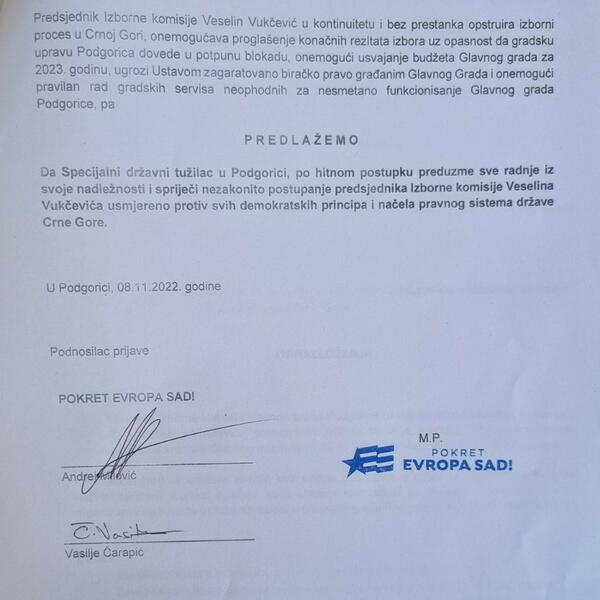 Pokret Evropa sad podnio je Specijalnom državnom tužilaštvu krivičnu prijavu protiv predsjednika Izborne komisije Glavnog grada Veselina Vukčevića.