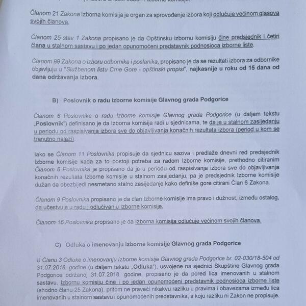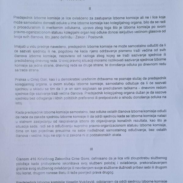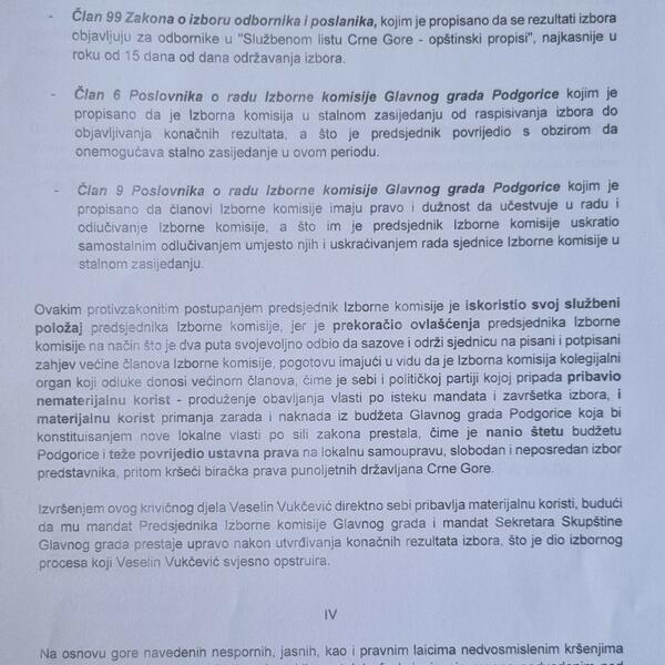 U krivičnoj prijavi se navodi da je Vukčević (DPS) time prekršio Ustav Crne Gore "u dijelu prava građana na lokalnu samoupravu, prava birača da biraju i budu birani".