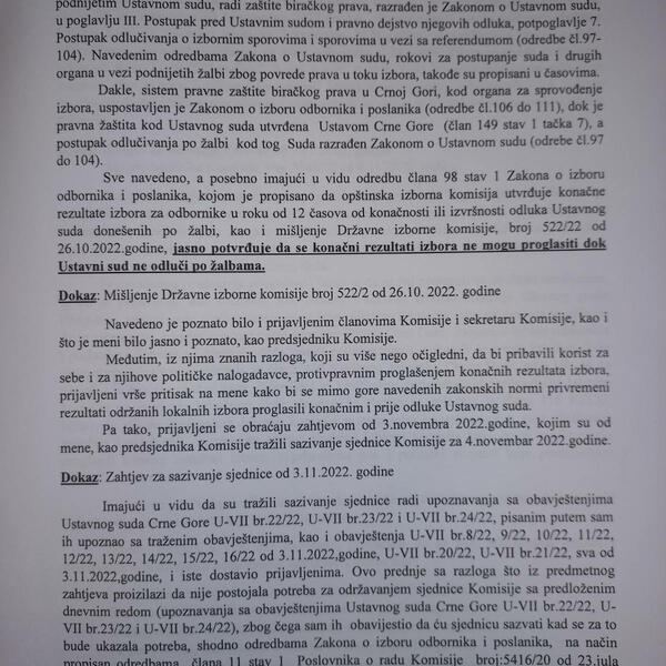 "Na način što se zahtjevom od 7. novembra obraćaju meni i traže sazivanje sjednice IK Glavnog grada za 7. novembar sa predlogom dnevnog reda - utvrđivanje konačnih rezultata za izbor odbornika u Skupštini Glavnog grada Podgorica održanih 23. 10. 2022. godine. S tim u vezi, a znajući da bi postupanjem po njihovom zahtjevu ušao u zonu krivične odgovornosti, istima pisanim putem odgovaram i još jednom upoznajem sa zakonskom procedurom i ukazujem da se nijesu stekli uslovi za sazivanje sjednice Komisije", poručio je Vukčević u prijavi.