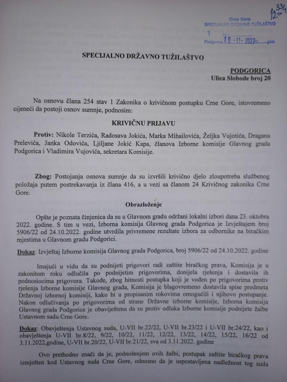 Predsjednik Izborne komisije (IK) Glavnog grada Veselin Vukčević podnio je danas Specijalnom državnom tužilaštvu (SDT) krivičnu prijavu protiv članova IK, Nikole Terzića, Radosava Jokića, Marka Mihailovića, Željka Vujotića, Radana Prelevića, Janka Odovića, Ljiljane Jokić Kape i sekretara IK Vladimira Vujovića zbog sumnje da su, kako tvrdi, zloupotrijebili službeni položaj.