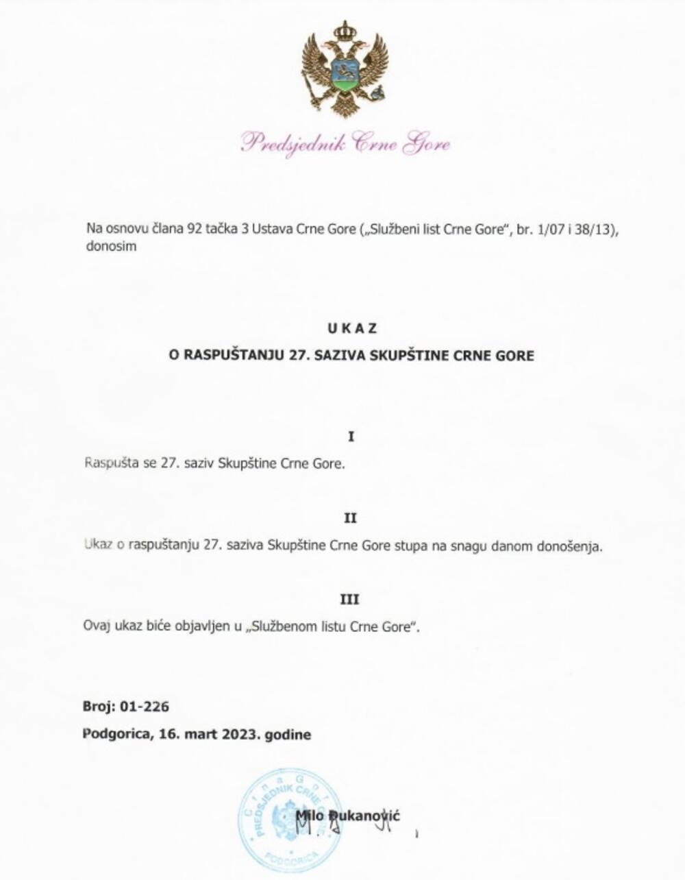 "Raspušta se 27. saziv Skupštine Crne Gore. Ukaz o raspuštanju 27. saziva Skupštine Crne Gore stupa na snagu danom donošenja. Ovaj ukaz biće objavljen u Službenom listu Crne Gore", navodi se u Ukazu.