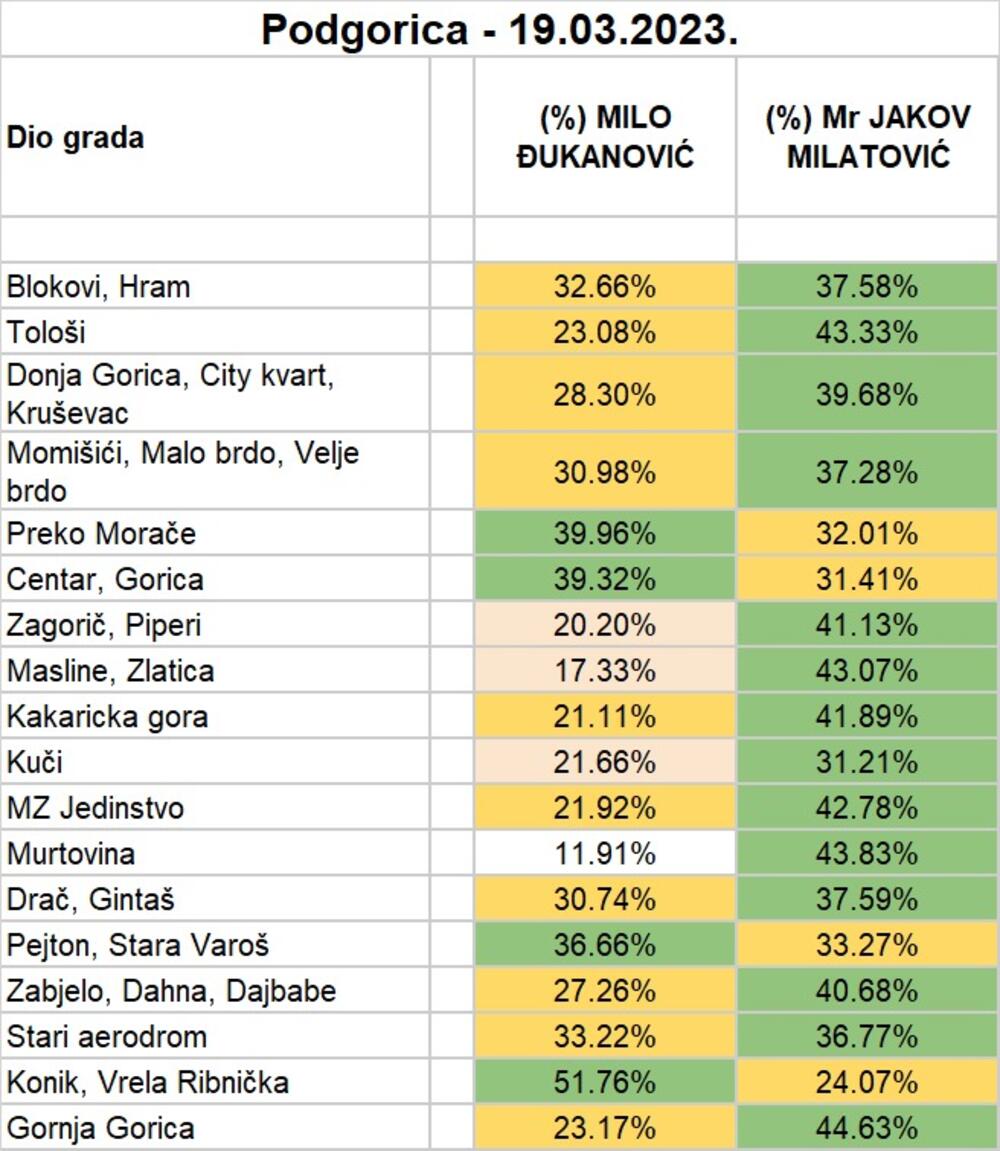 Dragaš je uz saopštenje dostavio i podatke koliko je u Podgorici, po naseljima, u procentima glasova osvojio Đukanović, a koliko predsjednički kandidat Pokreta Evropa sad Jakov Milatović.