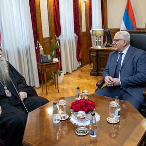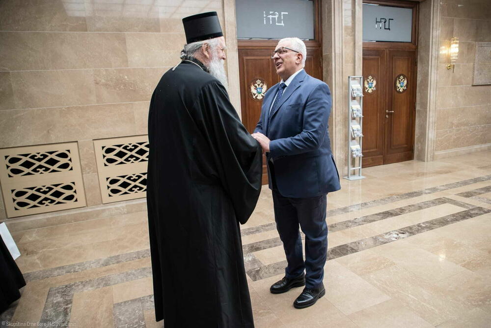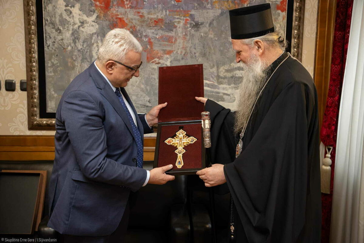 Mandić i Joanikije u ponedjeljak su se sastali u državnom parlamentu, a na kraju razgovora predsjednik Skupštine uručio je gostu panagiju Bogorodice s malim Hristom na rukama, krst sa zlatnim lancem, časni krst, kao i ikonu Svetog Simeona Mirotočivog "zaštitnika glavnog grada".