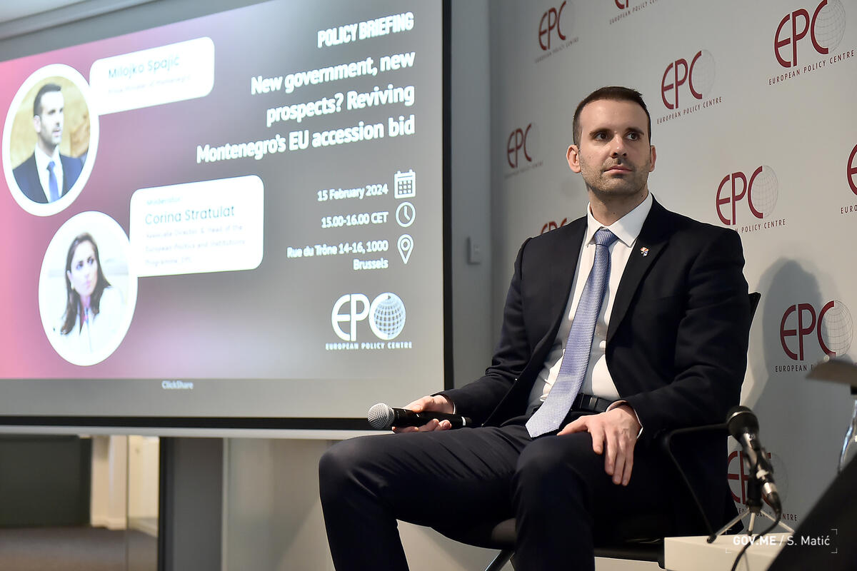 Premijer Milojko Spajić u sali Centra za evropsku politiku (EPC) u Briselu je u četvrtak održao politički brifing na temu „Nova vlada, novi izgledi? Oživljavanje nastojanja Crne Gore za pristupanje EU” i tom prilikom kazao da Crna Gora može "zauzeti upražnjeno mjesto 28. članice" Evropske unije 2028. godine.