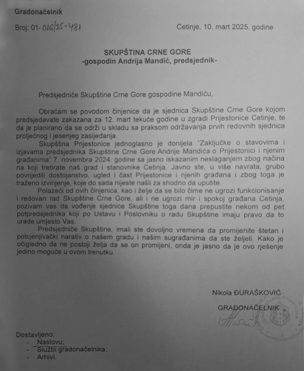 "Obraćam se povodom činjenice da je sjednica Skupštine Crne Gore kojom predsjedavate zakazana za 12. mart tekuće godine u zgradi Prijestonice Cetinje, te da je planirano da se održi u skladu sa praksom održavanja prvih redovnih sjednica proljećnog i jesenjeg zasjedanja", istakao je Đurašković u pismu Mandiću.