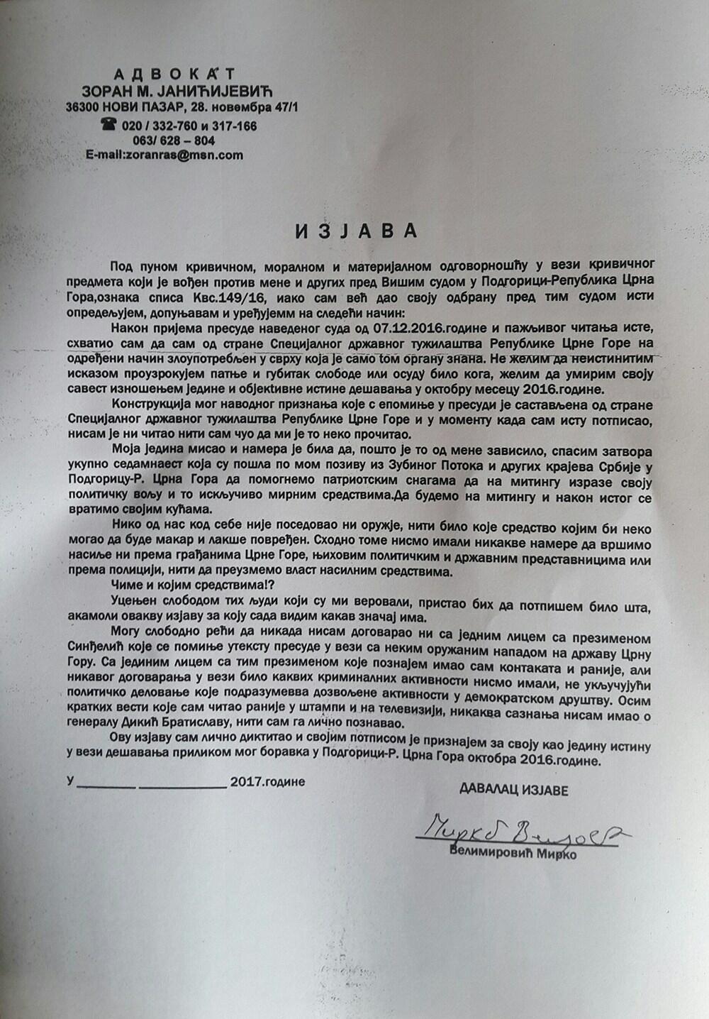 “Nakon prijema presude od 7. decembra 2016. godine i pažljivog čitanja iste, shvatio sam da sam od strane Specijalnog tužilaštva na određeni način zloupotrijebljen, u svrhu koja je samo tom organu znana. Ne želim da neistinitim iskazom prouzrokujem patnje i gubitak slobode ili osudu bilo koga. Želim da umirim svoju savjest iznošenjem jedine istine od oktobra 2016. godine. Konstrukcija mog navodnog priznanja koja se pominje u presudi je sastavljena od strane Katnića i istu nisam ni čitao, samo sam je potpisao” saopštio je Velimirović.