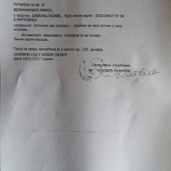 “Moja jedina namjera kada sam je potpisao je bila da spasim zatvora 17 osoba koje su došle po mom pozivu na mitingu da izraze nezadovoljstvo i to isključivo mirnim sredstvima. Niko od nas nije imao nikakvo oružje. Ucijenjen slobodom ljudi koji su mi vjerovali pristao bih da potpišem bilo šta”, navodi Velimirović u saopštenju.