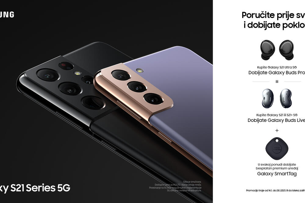 Kupci koji u navedenom periodu putem online prodavnice rezervišu Samsung Galaxy S21 i Galaxy S21+ dobijaju na poklon uređaj SmartTag lokator i bežične slušalice Samsung Galaxy Buds Live u crnoj boji, dok oni koji rezevišu Samsung Galaxy S21 Ultra dobijaju na poklon SmartTag lokator i bežične slušalice Samsung Galaxy Buds Pro u crnoj boji.